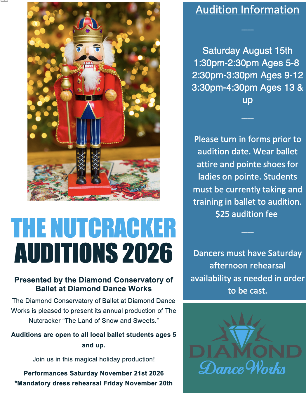 Please turn your audition form into the front desk or email it to ballet@DiamondDanceWorks.com prior to the audition date. The audition fee is $25 per dancer. Dancers enrolled in the Diamond Conservatory of Ballet must attend the audition for final casting.